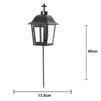 Wunderschöne Grablaterne mit 2 verschiedenen Dekorationen. Die Laterne ist 21 cm hoch ohne Dekoration und der Erdspieß 25 cm. Wählen Sie eine Kerze aus unserer großen Auswahl an Outdoor-Kerzen.