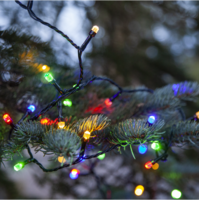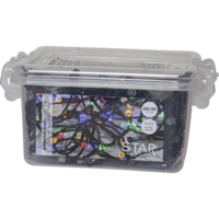 Lichterkette mit 200 mehrfarbigen Lichtern für den Außenbereich mit schwarzem Kabel. Die Abdeckungen verleihen dem Licht eine sternförmige Reflexion. Hübsch zu dekorieren in Ihrem Garten und in Ihrem Weihnachtsbaum. Der Transformator hat einen eingebauten Timer, drücken Sie den Knopf für drei Sekunden zum Starten und der Knopf leuchtet grün, sobald der Timer eingeschaltet ist. Die Lichterkette wird in einer Kunststoffbox mit Tragegriff geliefert, perfekt zur Aufbewahrung, wenn die Lichterkette nicht in Gebrauch ist